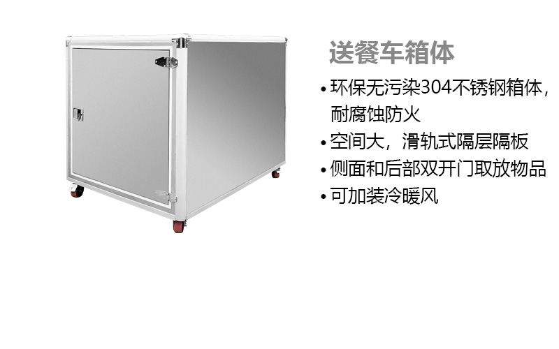 餐車箱體特點(diǎn):多種箱體材料可以選擇,保溫隔熱的加厚PP板、環(huán)保無污染的304不銹鋼材。箱體具有耐腐蝕防火特點(diǎn)。空間大,滑軌式隔層隔板。 側(cè)面和后部雙 開門方便用戶 取放物品。也可根據(jù)需要可 加裝冷暖風(fēng)。