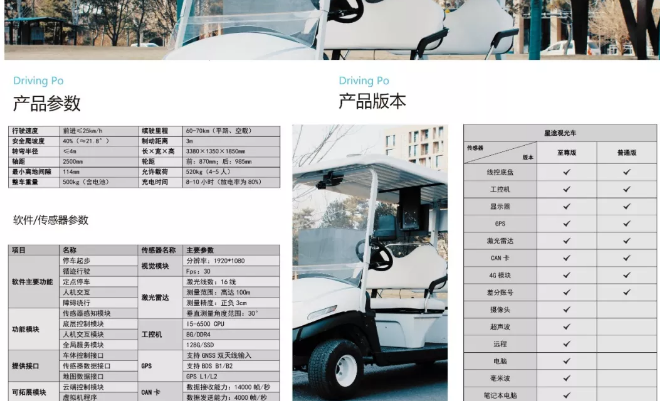 Driving Po星途智能網聯接待車是一款安全可靠的低速智能網聯車產品,可在園區等半封閉道路完成各種無人駕駛、智能網聯駕駛功能,高度還原無人駕駛、智能網聯乘用車傳感器方案,100%自主開發,車輛支持硬擴展和軟件二次開發。